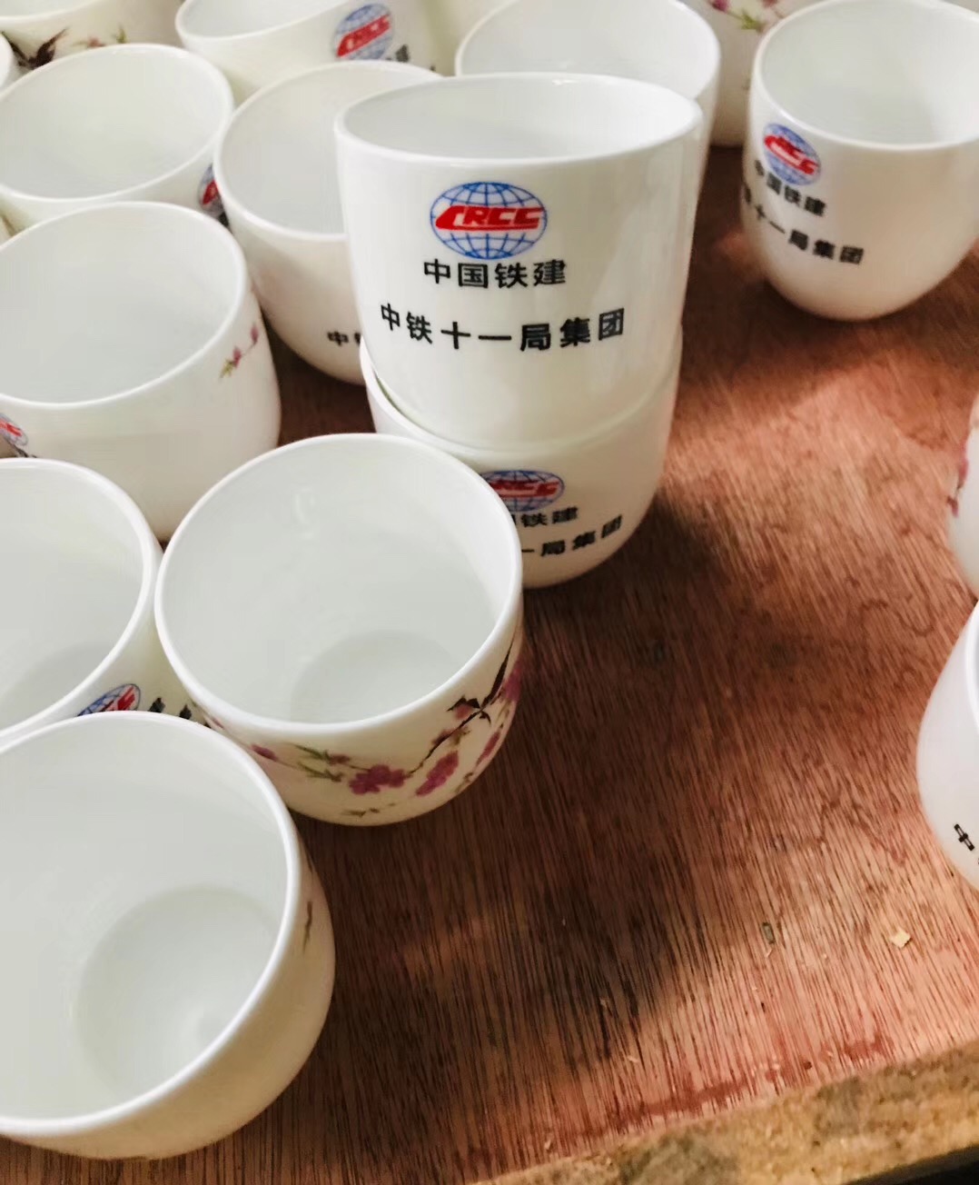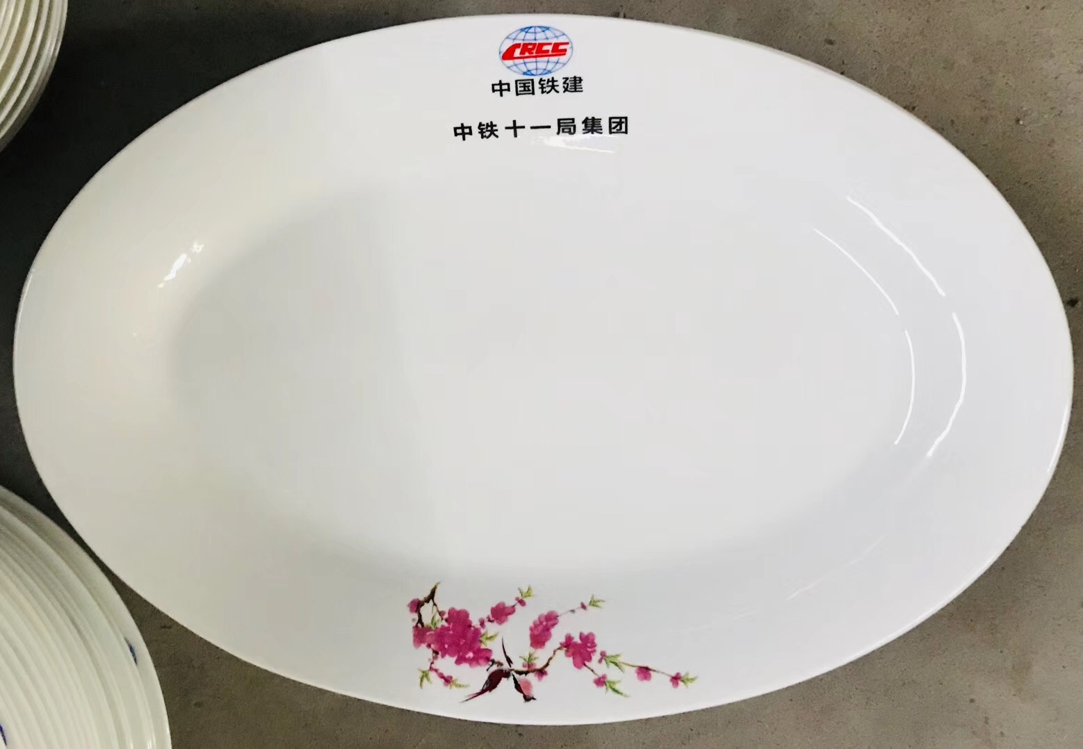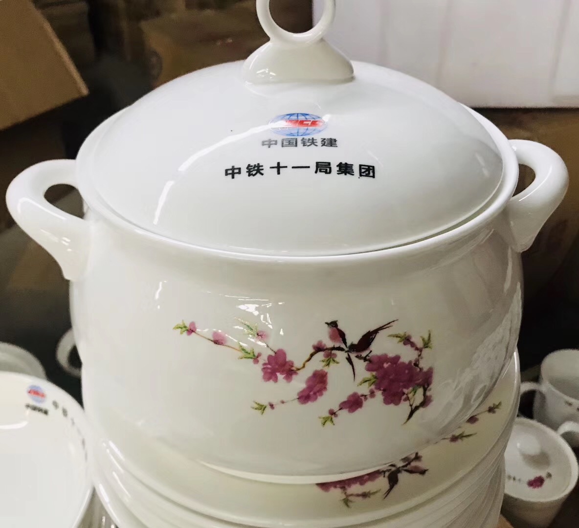 ,這次定制的餐具圖案一支梅花,畫面中鐵十一局商標,產品有魚盤,深盤,煲,碗,小蝶,杯子,定制的