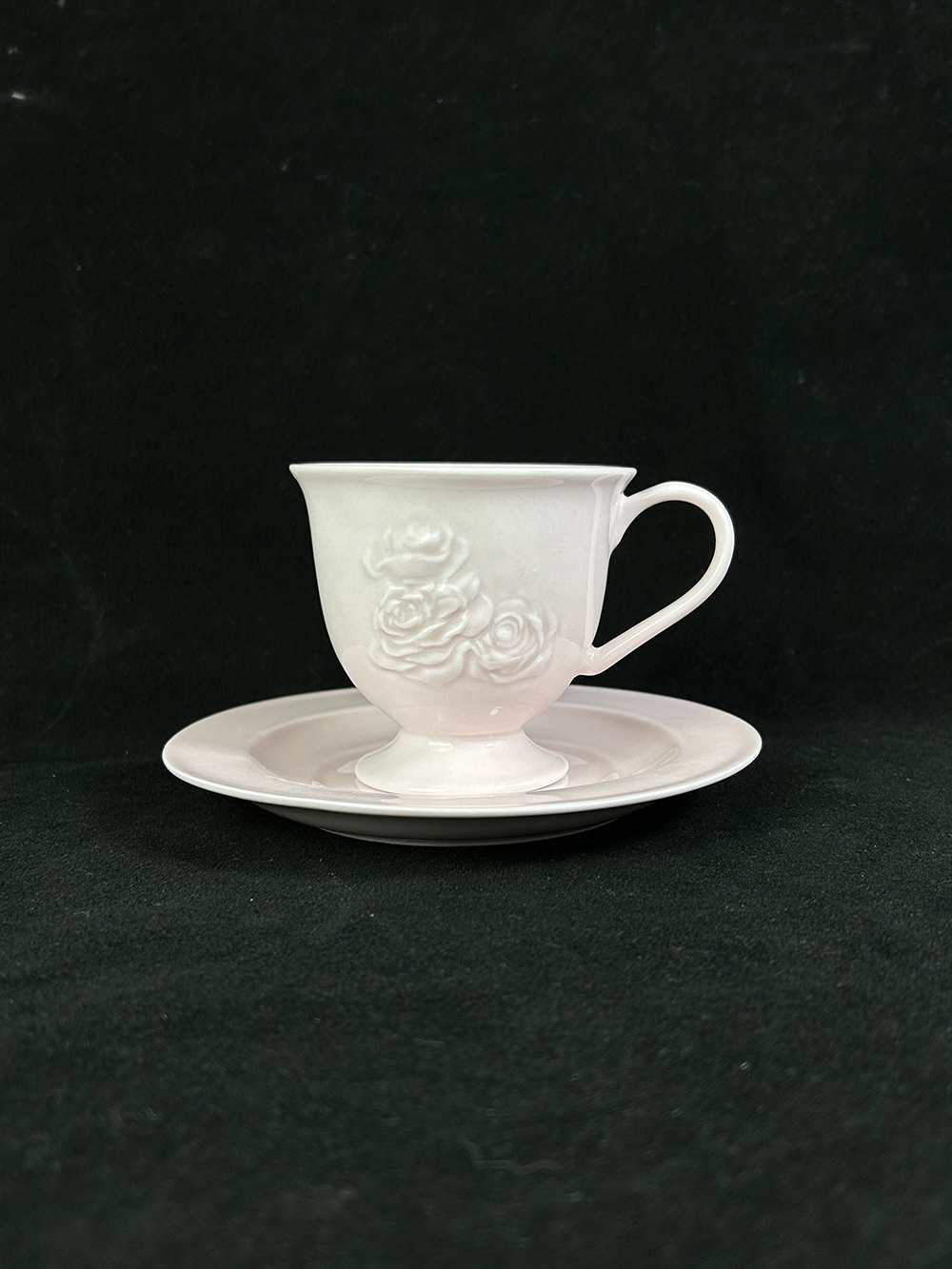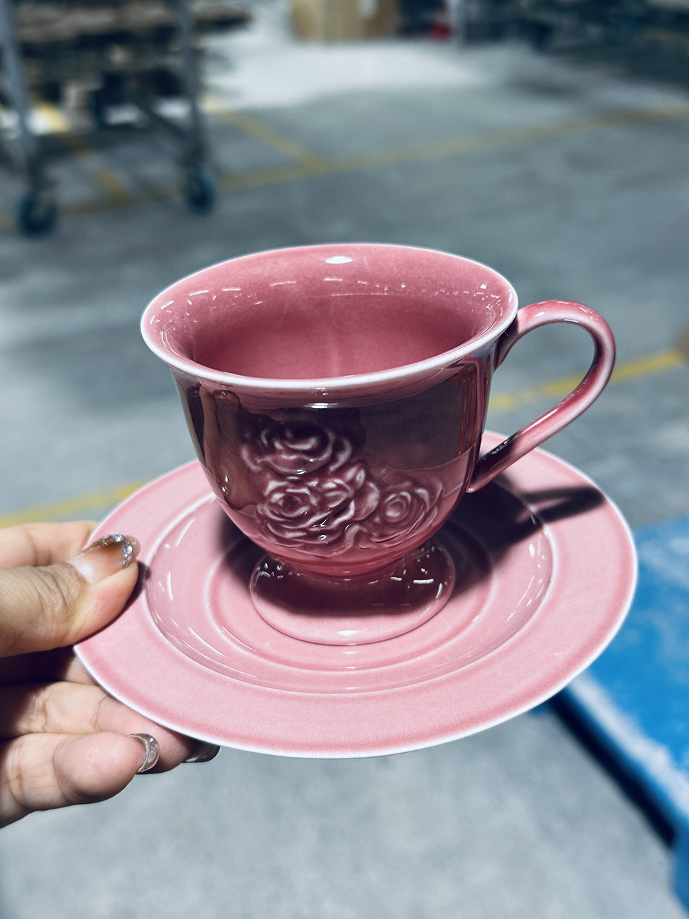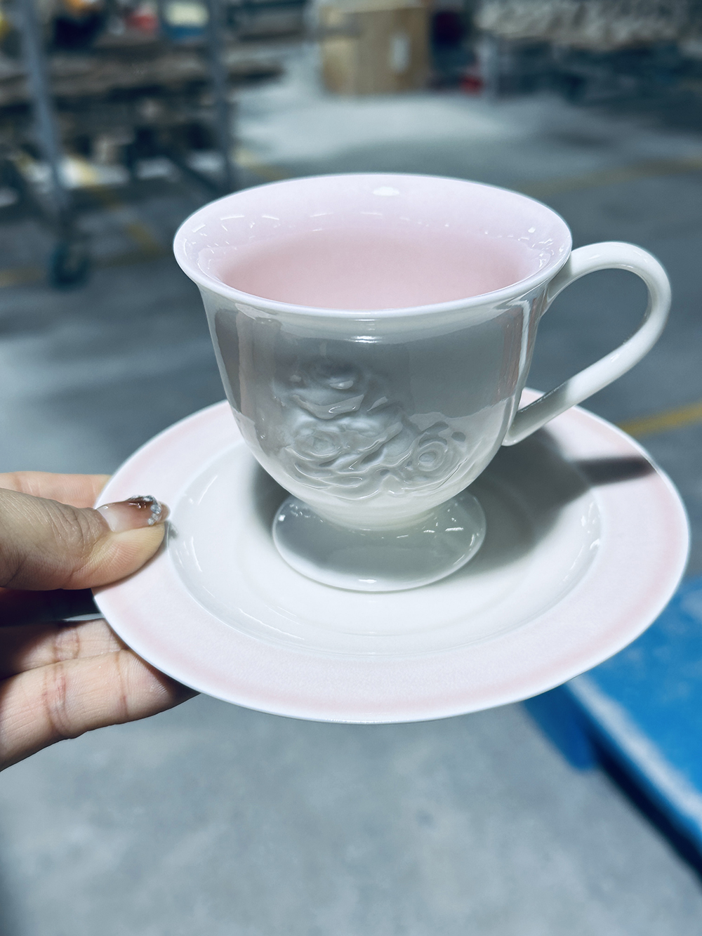 客戶找到我們,想要定制一批有玫瑰浮雕的咖啡杯,經過不斷設計調整,最終選定,下面是產品的實拍圖: